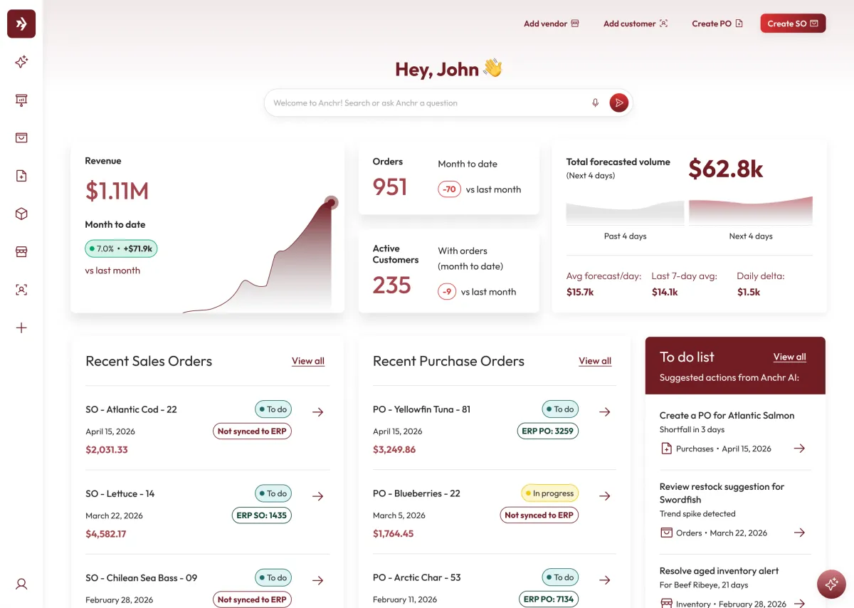 Their work included partnering with a Boston-based seafood distributor and mapping processes on the factory floor. Anchr points to routine tasks such as manually entering orders into ERP systems early in the morning, making purchasing decisions in spreadsheets, and reconciling invoices across separate tools.