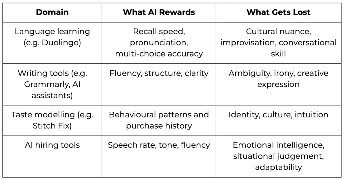 It becomes clear that AI systems actively shape how users understand what intelligence is, and as learners, writers, or candidates adapt to AI's expectations, they will inevitably try to match behaviours with what can be scored, losing important context that often makes all the difference.